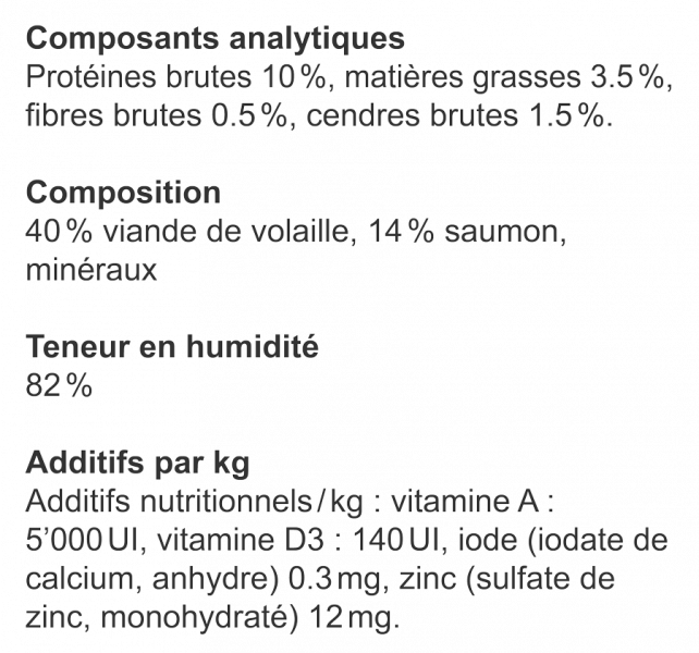 De manière générale : un aliment de haute qualité pour chiens et chats se reconnaît à une liste d’ingrédients transparente et à des additifs bien motivés. Plus la liste des ingrédients est claire et compréhensible, mieux vous pouvez évaluer la qualité de la nourriture.